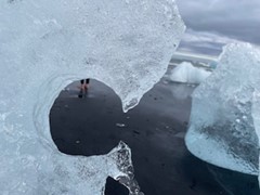 由于前几天已摔了三个跟头,左手的肿刚消,若谷走在冰块上走得小心翼翼艰苦异常,看着雪儿和鱼儿在冰上轻盈地游走如履平地,脑海中浮现出射雕中的铁掌水上漂,眼前只得无不专注脚步的同时欣赏千姿百态的冰钻,冰河中缓缓流淌着前一秒趾高气扬,后一秒一头跌进激流久久不得翻身的浮冰,或如顽童枕着双臂乘兴漂流仰望晴空,或如成道僧侣在水上合掌盘膝而坐,与和黑沙滩行注目礼的自然冰雕相映成趣。