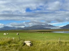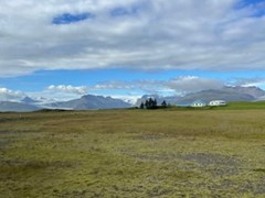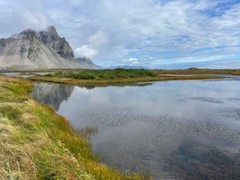 早晨在霍芬旅馆旁的步道上走走, 早晨的海边清新宁静。由于前一天没来得及去, 一大早儿行程半小时去Stokksnes(史托克角),冰岛东南部的一座岬角半岛,连接着冰岛南岸与东部峡湾两大景区,与杰古沙龙冰河湖(Jökulsárlón)与瓦特纳冰川国家公园(Vatnajökull)相距不远。冰岛最著名、最受摄影师青睐的山峰之一:西角山(Vestrahorn),海拔约为454米,似汉字的“山”字一般棱角分明,山顶的嶙峋尖角错落有致,山脚下还栖息着宁静的湖泊,西角山因造型独特,又名“蝙蝠山”;天光山影倒映入湖面的绝景无比动人,故而又有人称其为“倒影山”、“天空之镜”。