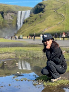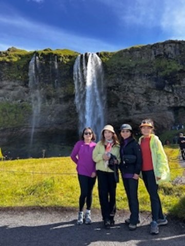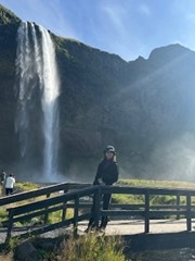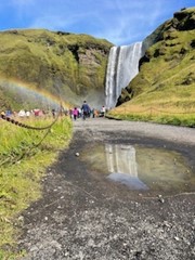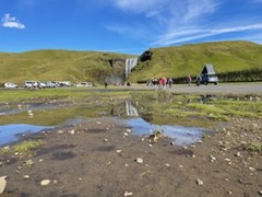 几经商讨没有去看飞机残骸。沿一号公路南下终于到黄金圈,一个小时后先冰岛南岸最著名的两大瀑布之一斯科加瀑布(Skogafoss),另一个是15分钟车程外的塞里雅兰瀑布(Seljalandsfoss)。两座瀑布的高度相仿,却形态各异,各具美态。塞里雅兰瀑布是冰岛少数可以穿行的瀑布;而斯科加瀑布则相传藏着远古海盗的宝藏。