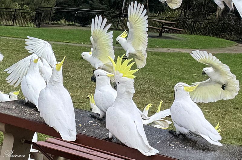 导游说,其实我是不应该带鸟食喂它们的,只是为了你们能看到这样的景观。真的是很感谢导游,让我们看到了这样壮观的硫冠凤头鹦鹉群。这是一日游最令人开心的一幕。