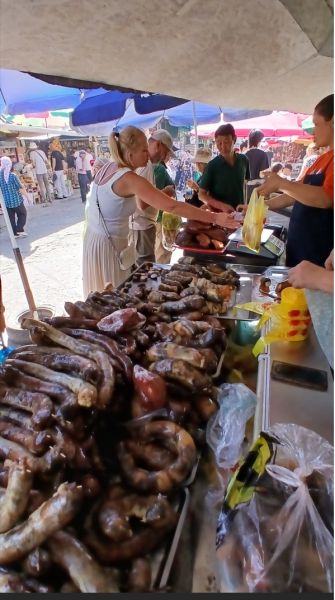 下午开始行程,导游是一个年轻的小伙子。人比较腼腆,英语不是很好,人还是不错的。第一个景点是奥什大巴扎(集市)。琳琅满目的商品包括堆成小山的香料、干果、糖果,悬挂着的各式传统毡帽,以及新鲜的牛羊肉区。在这里我第一次尝试了马肉香肠。马肉在此国是很平常的。5个斯坦中的4个都是如此,只有土库曼斯坦不吃马肉。给我印象极深的是大大小小的面包,上面带着花纹图案,像是工艺品。在这里,你可以与友善的商贩讨价还价,品尝街头小吃(比如刚出炉的萨姆萨),真正融入当地人的日常生活。这里像是一座活生生的民俗博物馆。