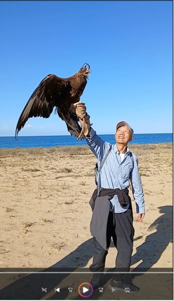 大家的午饭是在湖边吃自己早上准备的便餐,没有地方坐。湖边的基础设施还不完善。下午我们看了猎鹰表演。可以说这是难得的机会。如今世界上还有多少人训练老鹰捕猎呢?表演很精彩,小伙子是蒙古族人,他的马也英俊。猎鹰可以从 约 1–2 公里远甚至更远的地方发现老鼠大的猎物,猎鹰的视网膜上密集的视锥细胞数量远高于人类,大约是人类的 5–8 倍。他还表演了猎犬加猎鹰配合捕猎。最后大家分别让蒙眼的猎鹰站在手臂上照相。相当刺激。他还做了射箭表演,并让大家尝试。这是吉国旅游的高光时刻,我强烈推荐此项目。