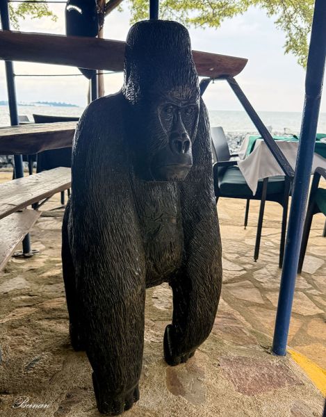 大猩猩守护在湖边的露天餐馆里。