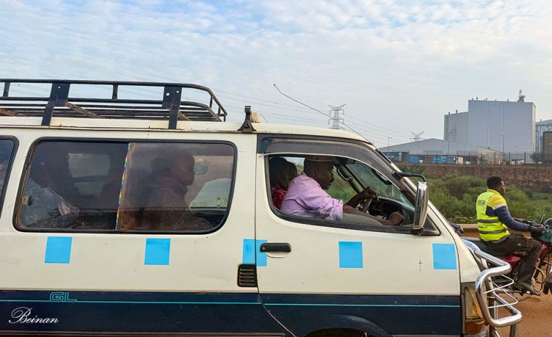 正是上班高峰时间,我们也借此机会一睹乌干达城市上班的车流。公路上看到最多的是白色有蓝格子的面包车,这是拼车小巴,是出租车的一种。没有固定时刻表,坐满才发车,乘客可以随时上下。
