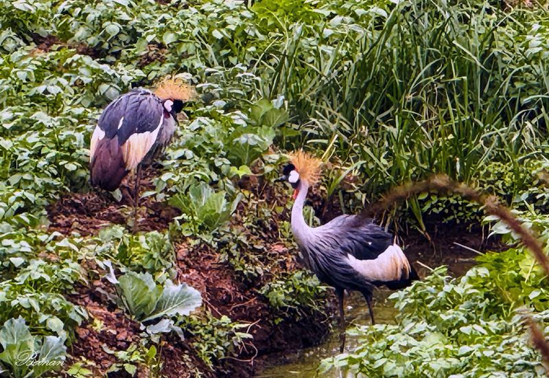埃迪突然将车停到路边,对我们说,那边大田里,有一对Grey Crowned Crane。这是乌干达的国鸟灰冠鹤。真没想到,会在大田里看见这么漂亮的鸟。