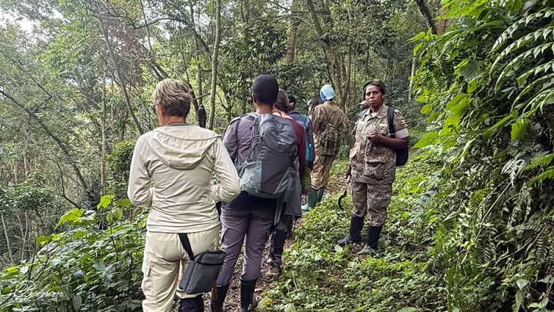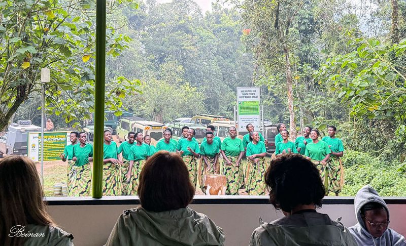 行前说明会很简要。一些注意事项我们都早已了解。比如,每个大猩猩家族每天最多接待8名游客;近距离观赏时间严格限制为一个小时;为保护大猩猩的健康,出现感冒、咳嗽、发热等症状的游客不得参加追踪活动,等等。