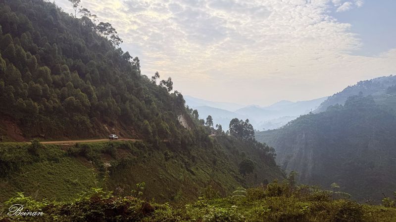 道路在山脊与谷地之间反复起伏。远处群山层层叠叠,轮廓被薄雾拉开。再次感叹乌干达得天独厚的自然条件。