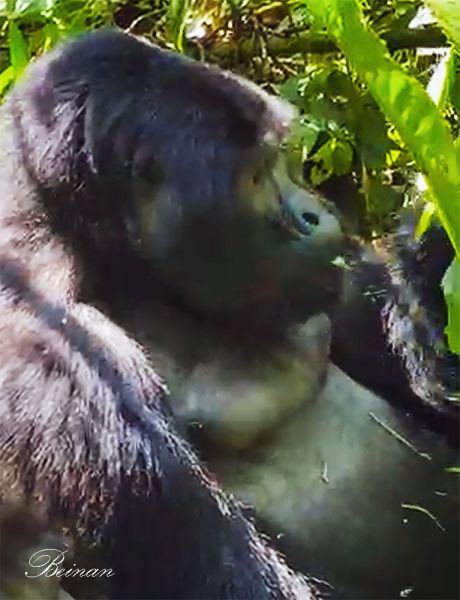 我们就这样近距离地看着银背,静悄悄的,没有人说话。忽然,我想起以前看过的一个纪录片,是美国灵长类学家黛安·弗西(Dian Fossey)和大猩猩在一起的情景。