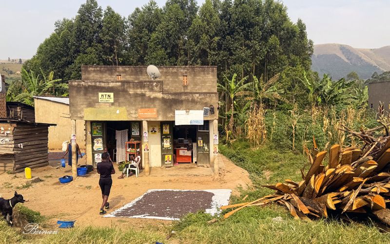 地上晾晒的是咖啡豆,上面肯定落满国道上的尘土。