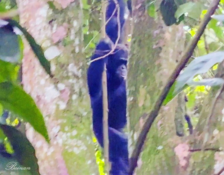 一直跟着我的见习导游小哥说,把手机给我,我帮你拍照。然后他就追着黑猩猩跑了。结果是拍到了一些树梢上的黑猩猩,但也不是很清楚。