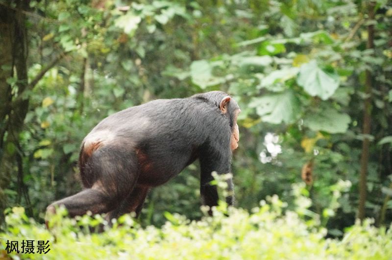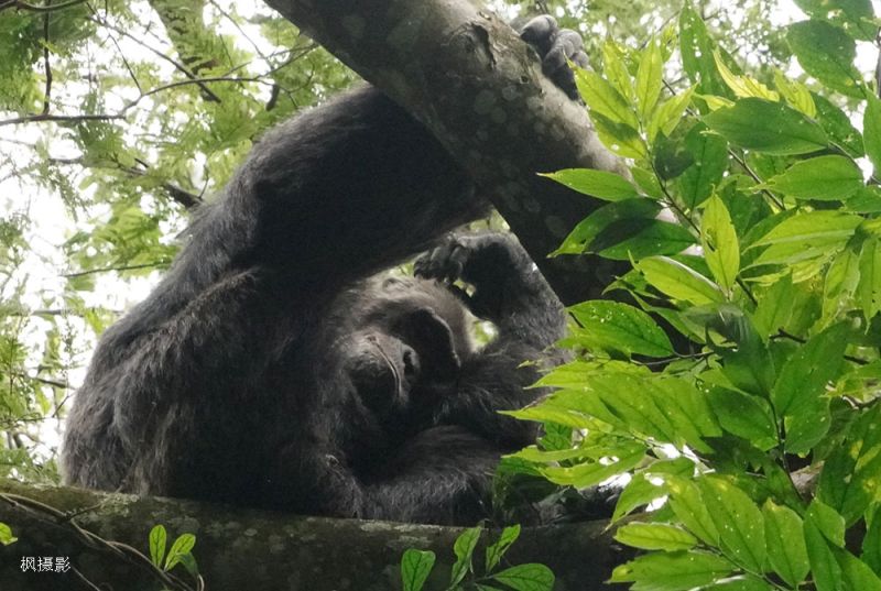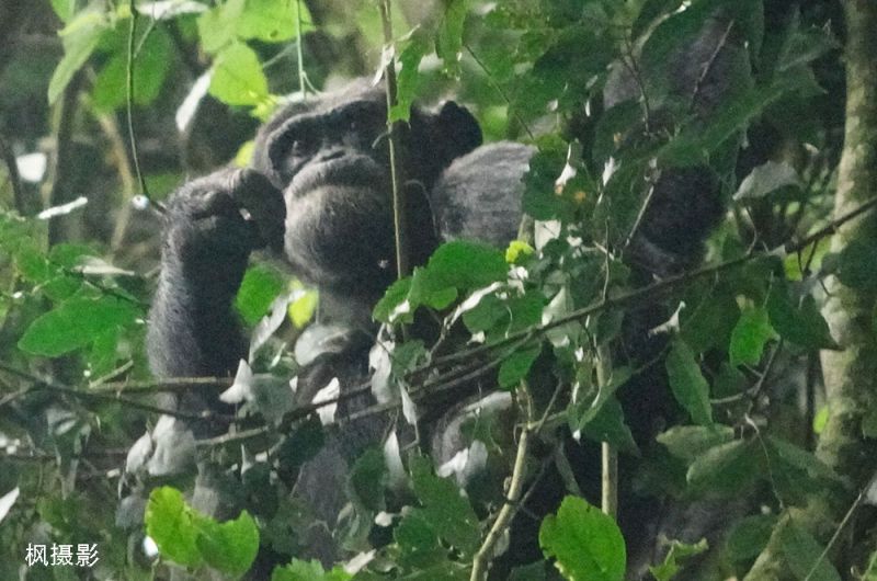我们意识到,追踪黑猩猩比追踪山地大猩猩更难。因为黑猩猩不会静止,更不会为了游客停留。它们在树冠间穿梭,跳跃、攀爬、突然消失,叫声先到,身影随后。我们仰头看的脖子都酸了,也没有清晰地看到它们。更别说在一个地方静静地看着它们了。
