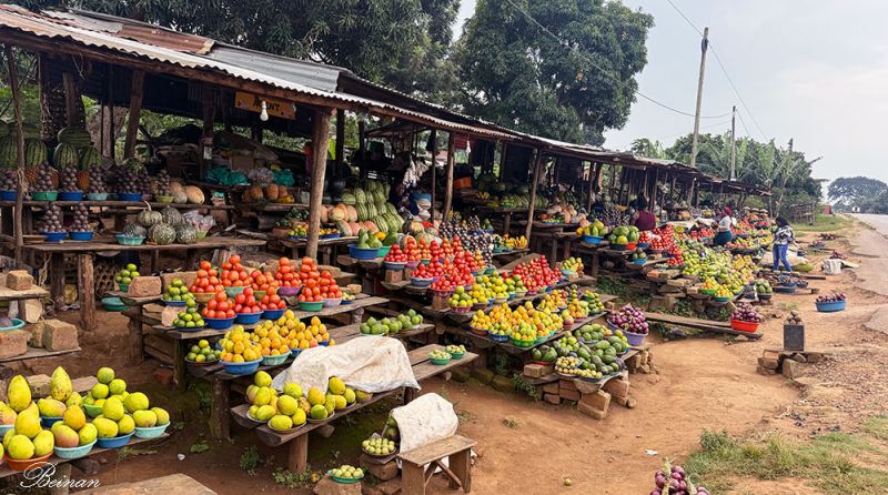 国道边也有让人感兴趣的地方。这个水果蔬菜摊吸引了我们的注意,赶紧让司机停车,掏银子为乌干达经济做贡献。