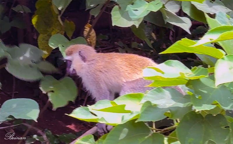 忽然,在树丛里看到一只黑脸的猴子。虽然一闪而过,老太还是抓住了它的模糊的身影。这是一只黑脸狒狒(Black-faced Patas Monkey),也叫帕塔斯猴。这种猴子是陆地上速度最快的灵长类动物,奔跑速度可达每小时55 公里。