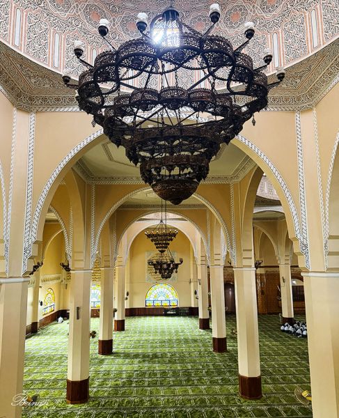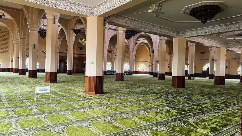 清真寺内部,巨大的吊灯悬在穹顶之下,空间被刻意拉高、拉空。与坎帕拉街头的狭窄与喧闹相比,这里像是城市短暂为自己保留的一口呼吸。