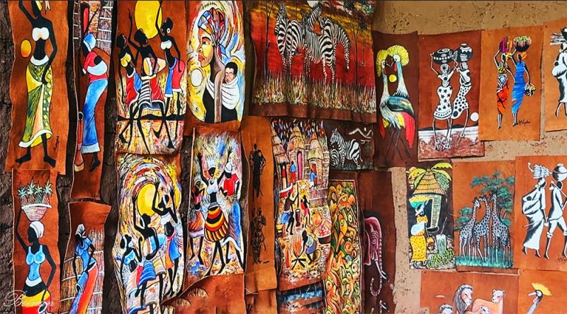 导游告诉我们,这里展示的都是她和她的同事们创作的树皮画。她的家乡有很多纳塔尔无花果树。村子里的父辈们负责制作树皮布,她们在旅游地区边画边卖。