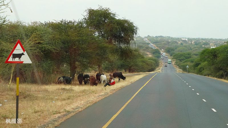 尽管道路两边是草原或农庄,还有成群的牛从公路走过,但是柏油平整、路面宽度够、标线清晰,和乌干达很多国道相比明显更现代化。