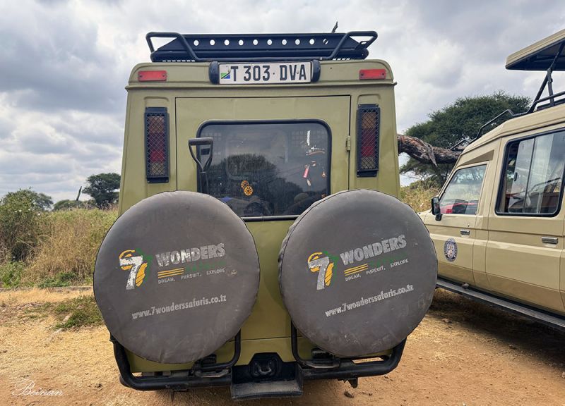 只能从车后的备用胎的罩子上分辨。我们的车有9个座位,我们4个人加一个司机,还是很舒服的。特别是顶棚升起后,我们可以站在座椅上任意换位置观景。如果坐满了9个人,就要遭点罪了。我们也看到了挤得满满的车子,行李都堆在了车顶。