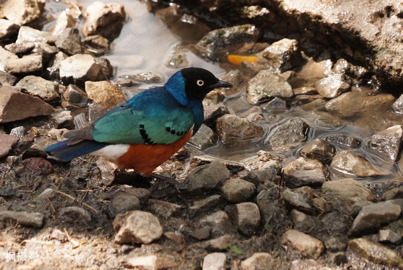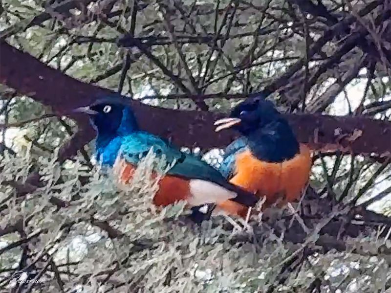 后来得知,这是东非常见的鸟,叫Superb Starlin,中文翻译为华丽椋鸟或超级椋鸟。它们的外观非常鲜艳,胸口橙色,背部蓝绿色带金属光泽,特别好看。