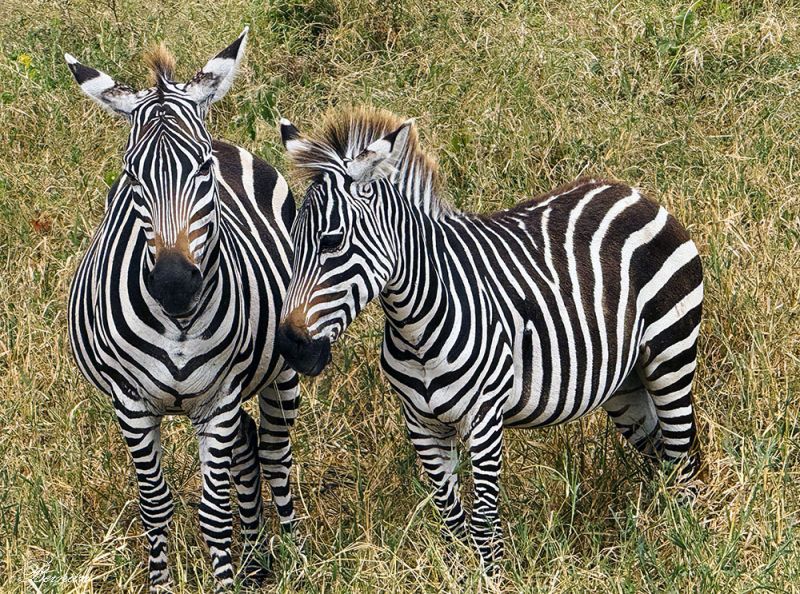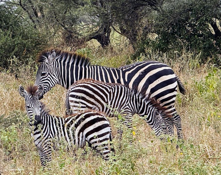 登上游猎车,进入公园不远就看到了一群斑马((Plains Zebra)。我们的车离它们很近,可以清晰地看到它们身上经典的黑白条纹。条纹独特,每只斑马都有不同的纹路。