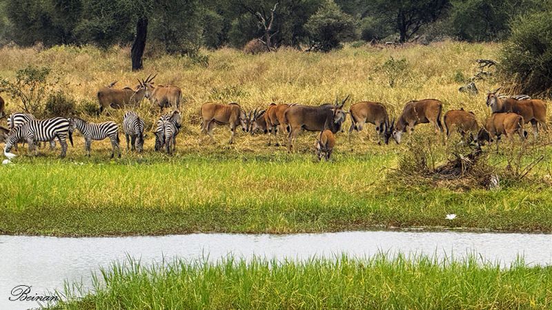 水边,一群斑马和一群普通大羚羊(Common eland)在一起静静地吃草。这是这里经常看到的“混合群”。斑马和普通大羚羊食性不同,不怎么竞争资源,混在一起反而更安全。