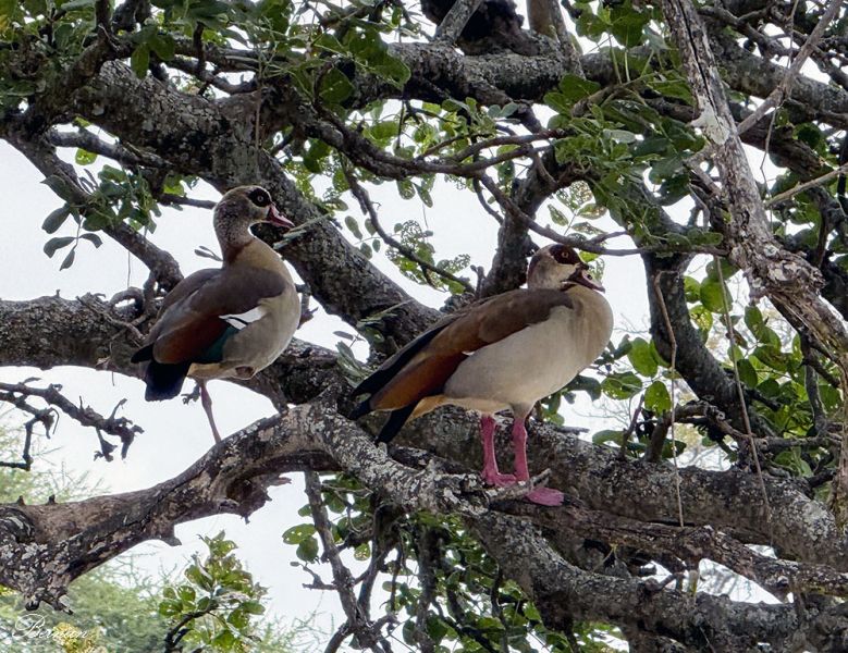 忽然,在河边的大树上看到了一对埃及鹅(Egyptian Goose)。我们看过的埃及鹅也不少了,它们总是成对的在一起。但这是头一次看到埃及鹅在树上。鹅?能上树?奇了!