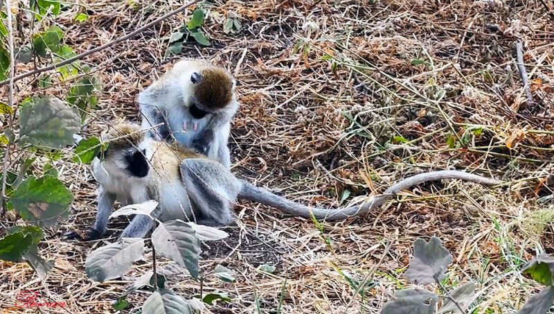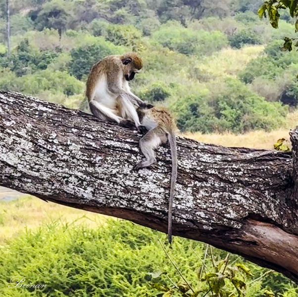 两只长尾猴在粗大的树干上,一只在为另一只梳理毛发。这种猴子的学名叫绿猴(Vervet Monkey),也叫非洲绿猴。