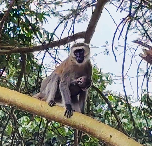 清晨在院子里散步,忽然眼前一闪,一只长尾猴蹿上了树。仔细一看,它怀里还有一个小宝宝。大大的眼睛,好可爱哦!