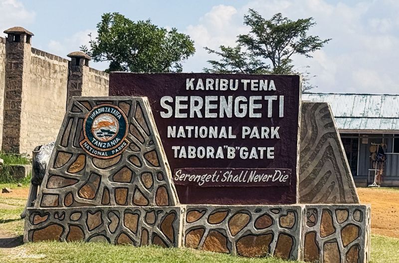 车子驶入塞伦盖蒂国家公园。这是坦桑尼亚的首座国家公园,建于1951年。牌子上有一句广为流传的话,“Serengeti Shall Never Die”(塞伦盖蒂永不消亡)。