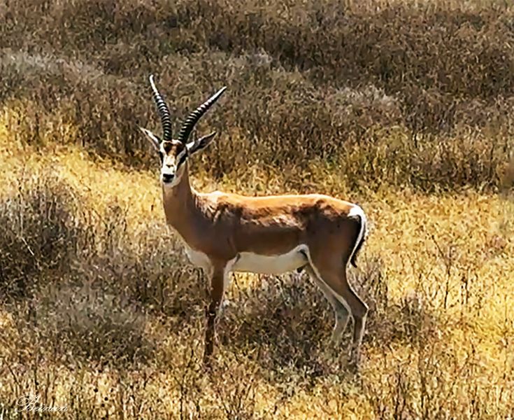 格兰特瞪羚(Grant’s gazelle)是比汤姆森瞪羚体型更大的瞪羚种类。它们的腹部和臀部是白色的,不论雌雄都有粗大的角,优雅弯曲,非常漂亮。