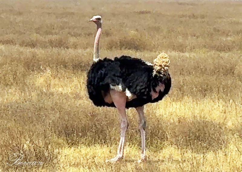 一只雄性鸵鸟(Male Ostrich)气宇轩昂地站立在金色草浪之间,仿佛在巡视自己辽阔的疆土。它的尾羽蓬松、自然向上鼓起,像一个绒球挂在后面。