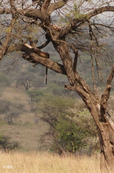 远远地,看见一只非洲豹(African leopard),也叫花豹。它懒洋洋地卧在高枝上,尾巴顺着树干垂下,前腿舒展,阳光正好洒在斑点的毛皮上,将前肢和尾巴镀上一层金色光辉。它的上方挂着刚捕获的猎物,像一枚无声的勋章。