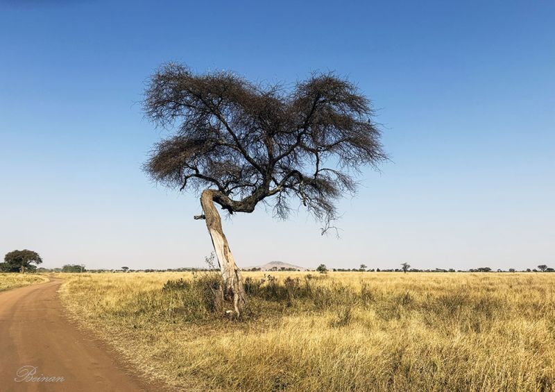 一棵金合欢树(Acacia tree)孤零零地立在路边。吸引我们的,是它那弯成直角的树干。