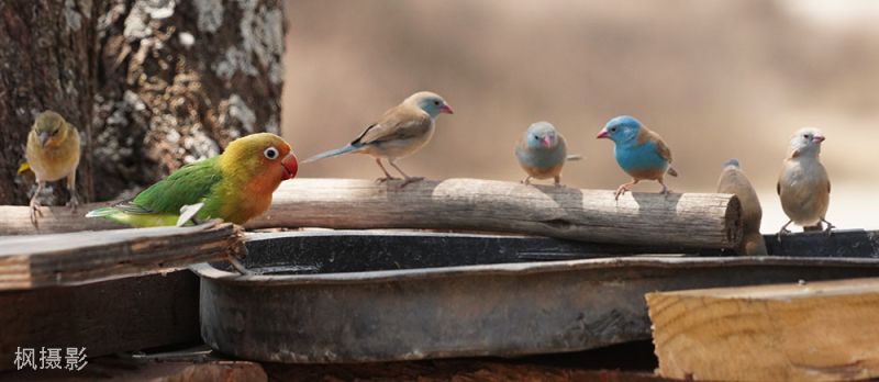 丽莲凤头鹦鹉(Lilian’s Lovebird), 也叫爱情鸟,是非洲特有的一种小型鹦鹉。它站在树枝上,鲜艳的红、绿、橙色在阳光下闪烁,非常醒目,给金色草原添上生动的小色块。