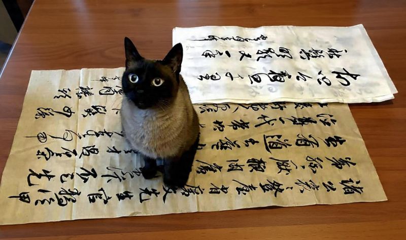海风诗社海渊兄(邱馆长)秀黑白双猫之秋霜点评他的书法:“她说:你写的,只配坐于我小姐之下。得下真功夫,练练魏碑了”。