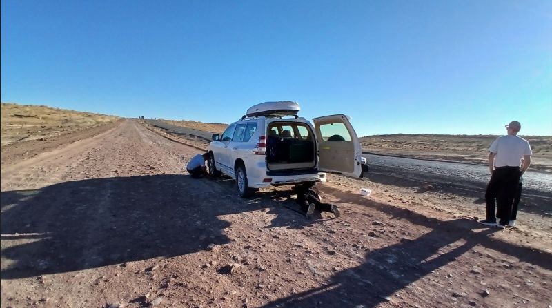 9月16日我们清晨前往沙瓦特-达绍古兹口岸,车程60公里,约1小时。目的是赶在9点钟口岸开放时抵达,不然入关可能会花很长时间。两国边检需乘坐摆渡中巴穿越1.5公里中立区,需支付小额费用。持邀请函可在口岸办理土库曼斯坦落地签证,签证费80-140美元,视国籍而定,须用平整完好状态的现金支付。土国的签证是五个斯坦中最难办的,也是全球签证最难获取的国家之一,其封闭的政策也让它显得像是在“闭关锁国“。 好在有旅行社的帮助,一切还算顺利。与土库曼导游和司机汇合后,我们驱车穿越卡拉库姆沙漠前往达尔瓦扎天然气坑Darvaza gas crater。车程270公里左右,基本上都在克拉库姆沙漠Karakum desert里行驶。路况极为恶劣,好像是公路年久失修,到处是坑坑洼洼和路面变形。我们旅游团友分乘5辆越野车,一路颠簸。更为糟糕的是我们所乘坐的车中途爆胎了,只好停下来换备用胎。而车上却没有工具,只好打电话让前面的车回来送工具。看来土国真是很穷,越野车的轮胎已经很旧了,根本不应该继续使用,更何况路况如此恶劣。好在车速不是太快,必然有翻车的危险。折腾了一通后,轮胎换好了。本来5个小时的车程变成了近7个小时。好在大家平安到达。穷国自有穷国的生存逻辑。我们曾经在埃及通往亚历山大港的路上遭遇爆胎,同样是车胎太老旧的问题。车胎是生命线。高速公路上爆胎有可能导致翻车,极为危险。当然除了惊吓外,也有惊喜。路上我们在一处休息,我们在一个买哈密瓜的地摊上吃到了有生以来最好吃的哈密瓜,有照为证。