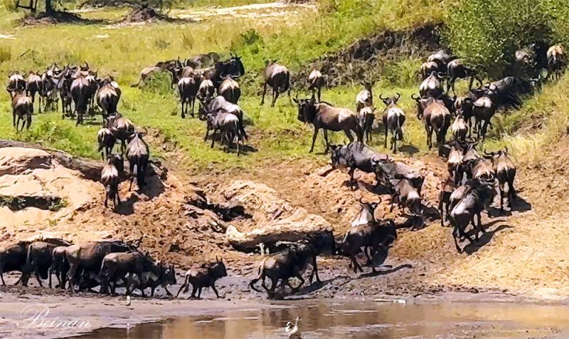 老太最搞不清楚的是,角马大迁徙应该是继续往北走,也就是从我们这边的南岸过河去到北岸的马赛马拉。而这群角马却反其道而行之,又渡河回来了。不过这个谜团还是留给您去探索、解密吧。