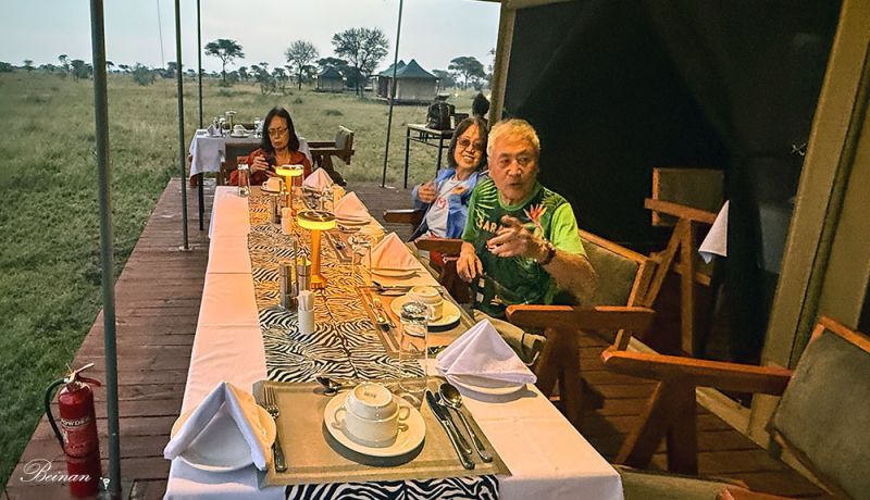 亲眼目睹角马大迁徙的震撼,使经历了一天13个小时游猎的老头老太仍处在兴奋之中,晚上住宿的营地又让我们耳目一新。