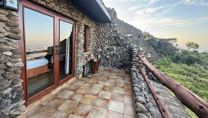 这家旅馆是恩戈罗恩戈罗地区最著名、历史也比较早的一家游猎旅馆,位置非常特别——直接建在火山口边缘(Rim)上。房间全部沿火山口边缘排列,每个房间都有面向火山口的私人阳台,可以直接看到火山口草原的景观。