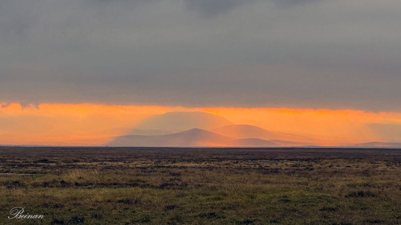 白线之后,是一层淡蓝色的山影——火山口的边缘,如同一道无声的屏障,将这片广阔围拢其中。它并不突兀,却让人隐约感到,这片看似无边的草原,其实被世界轻轻收住,安放在一个完整而封闭的空间里。