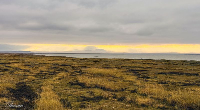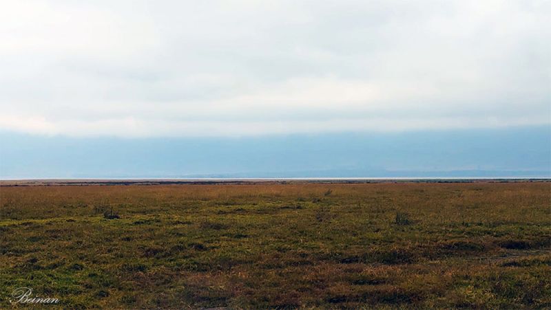 远处,一条细细的白线横在地平线上,几乎轻得像一笔不经意的勾勒。那是湖水,在天光下泛着微微的亮色,把厚重的草原与更远处的天空悄然分开。
