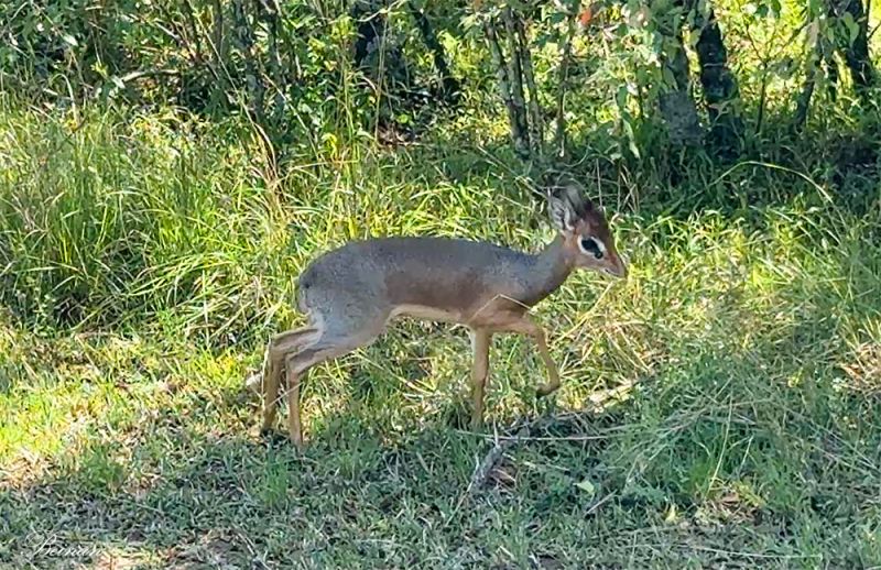 王大明白突然喊起来,停车停车!他的2.0的眼睛抓住了一只小羚羊。当地人叫Dik-dik,所以中文也叫迪克迪克羚,这个名字来自它受惊时发出的“dik-dik”警戒叫声。Dik-dik属于最小的羚羊之一,在广阔的非洲草原上,它们几乎像“隐形”的存在。所以这是我们第一次见到。它那大而黑的眼睛特别招人喜爱。