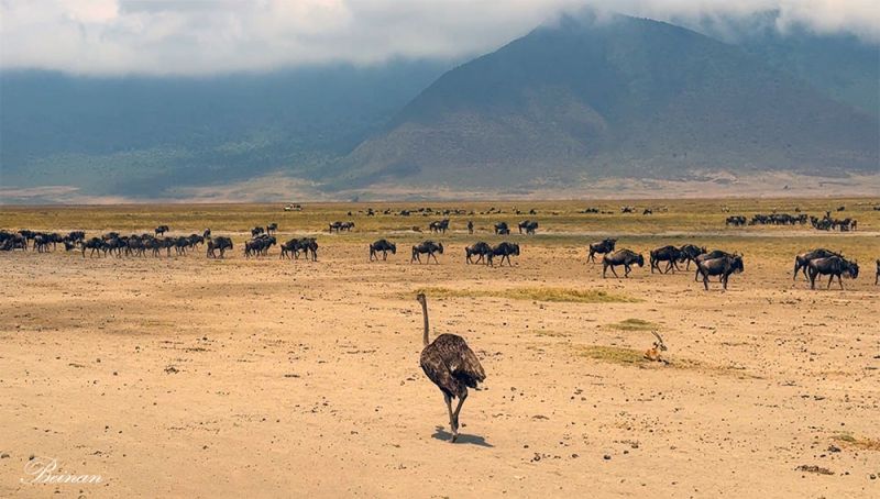 一只雌性鸵鸟挺胸昂头朝山脚下的角马(Wildebeest)群走去。导游说,这里的角马是固定居民,不用每年大迁徙。因为这里的火山灰土壤非常肥沃,盆地地形低洼,有地下水和常年湿地,所以角马一年四季都有草吃。它们没有必要长途跋涉,历尽风险去寻找嫩草。久而久之,在火山口盆地就形成了不用迁徙的角马群。