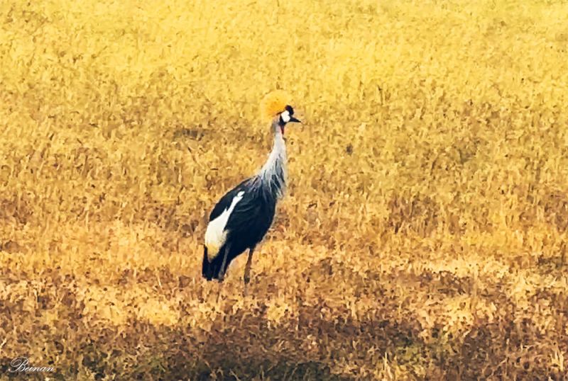 又看到了乌干达的国鸟灰冠鹤(Grey crowned crane)。灰冠鹤喜欢湿地和浅水草地,是整个东非草原湿地的代表性鸟类,不是乌干达独有。