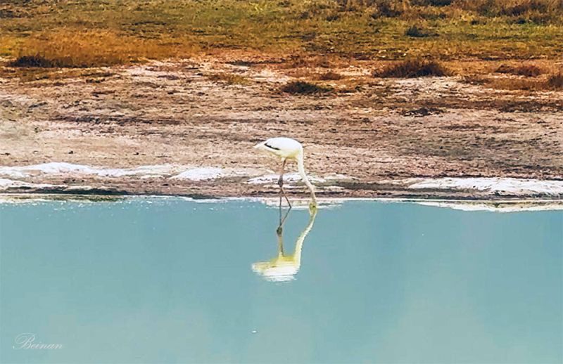 一只白色的火烈鸟(Flamingo)在湖边独自静静地觅食。它那修长的身影倒映在明镜般的湖水中,好像在和恋人亲吻。