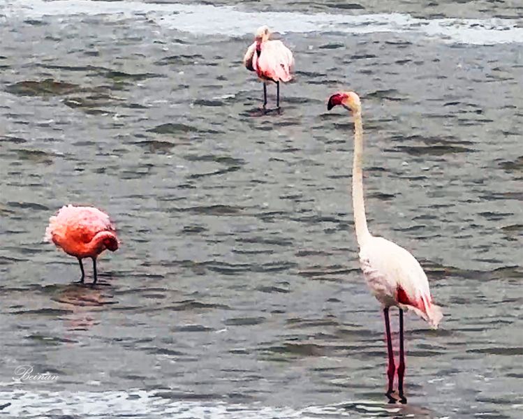 这里的火烈鸟有不同颜色。粉红色的火烈鸟体型较小些,它们的嘴是深红色,尖端是黑的。