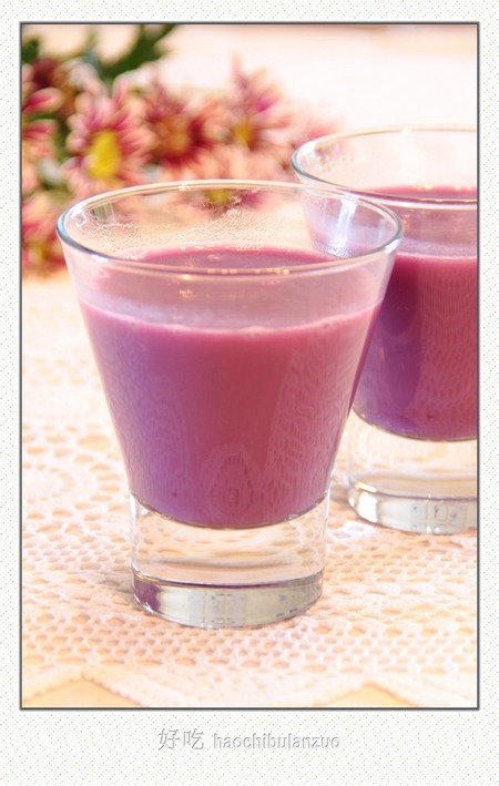 用豆浆机,加一杯半紫薯块, 加一杯鲜奶,加适量水或紫薯汤汁, 加一勺糖,