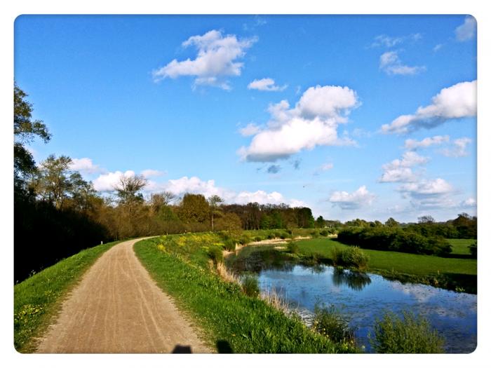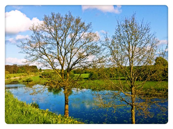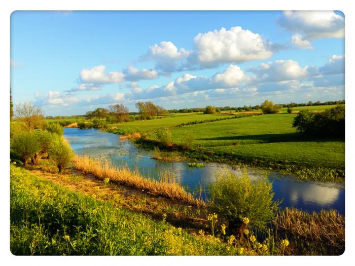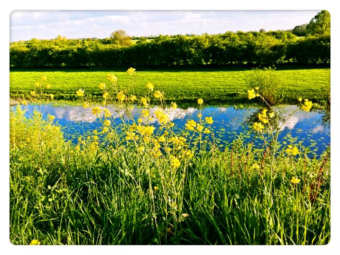 河水中宁静着油菜花的倒影