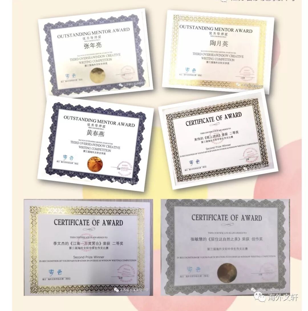 第三届“海外文轩文学奖”最终评选出了30名获奖作者及指导教师。一等奖由高一(4)班陈梦云同学获得,她的获奖作品是《那林似那人》。张理平、张年亮、陶月英等30位教师同时获得了“优秀指导教师”证书。