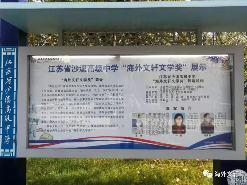 金秋十月的最后一天,海外文轩理事一弘,夏婳在太仓统战部副部长,侨办主任杨建新的陪同下来到江苏省沙溪高级中学,参加第三届海外文轩文学奖的颁奖典礼。