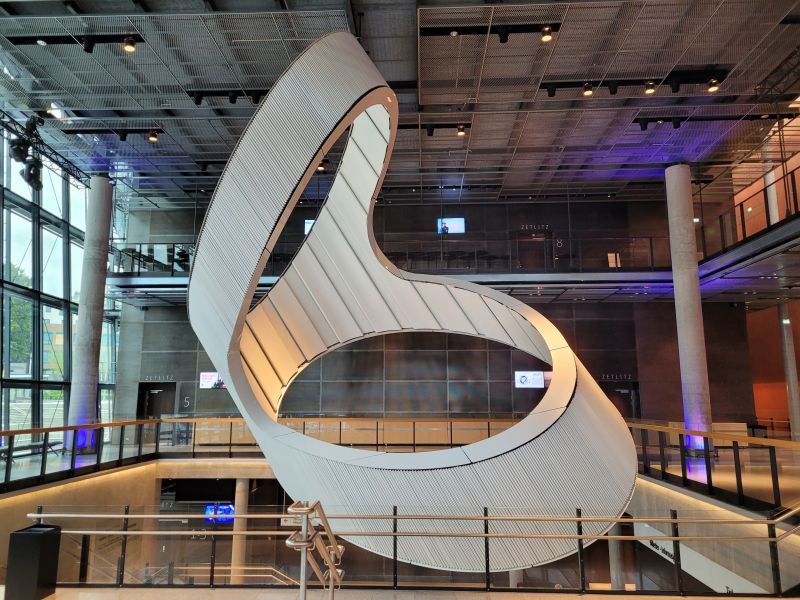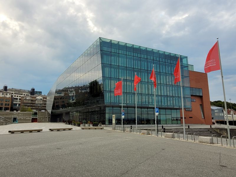 放下行李后我们开车去了海边的石油博物馆。到的时侯,它已经关门,只好在外面拍照留作纪念。我对鱼罐头博物馆(Fish Cannery Museum)不感兴趣,没有去看。 城市的中心在码头的东面,东岸边上是一排漂亮的传统式房子,基本上是酒吧和餐厅。城市中心的南边是一个不大的小湖,其中有喷泉,周围景观非常漂亮,这里是一个休闲散步的好去处。音乐厅在码头的西侧,估计挪威人喜欢音乐,在这只有12万人口的城市里,居然有一个规模相当不小,充满现代感的音乐厅。它的外面是淡绿色的玻璃,映射着云天峡湾和周围的景致。今天没有演出,但它却开放,允许入内,只是演奏大厅的门被锁上。从电梯来到高层,透过玻璃向外看,这里有相当好的景观。大厅的中空地方悬吊着一个巨大的抽象雕塑,好像是两个全音符成45度链接在一起。这是否意味着音乐是迷人的,一不小心,你就会被落入圈套?
